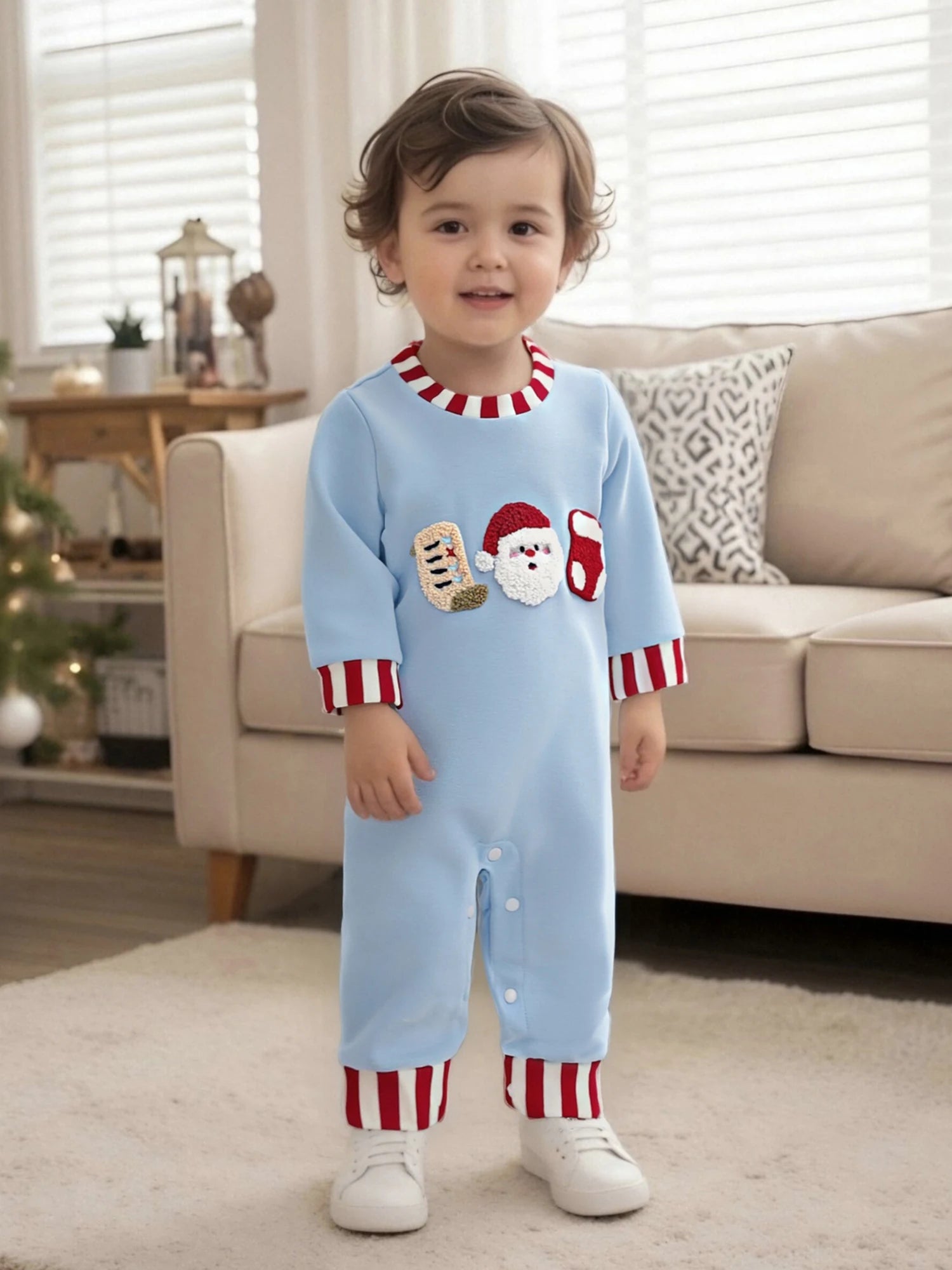 Baby Christmas Romper – Santa Embroidery Striped Long Sleeve Crew Neck Full-Length Jumpsuit