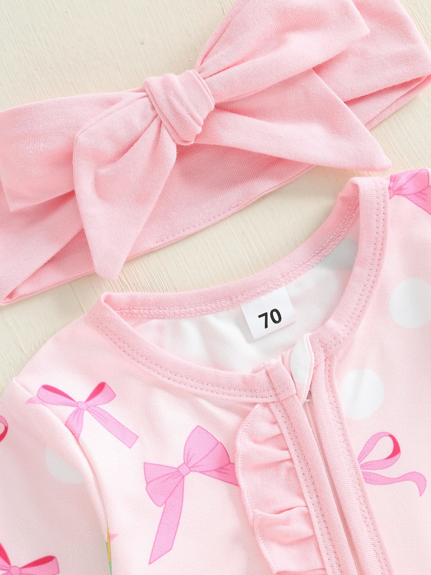 Dress your little girl in cozy fall style with this adorable 2-piece outfit set. Featuring a golf print long sleeve romper with ruffled trim and matching bow headband, it’s perfect for playtime, outings, or picture days. The zip front design makes dressing easy, while the soft fabric keeps your baby comfortable all day.