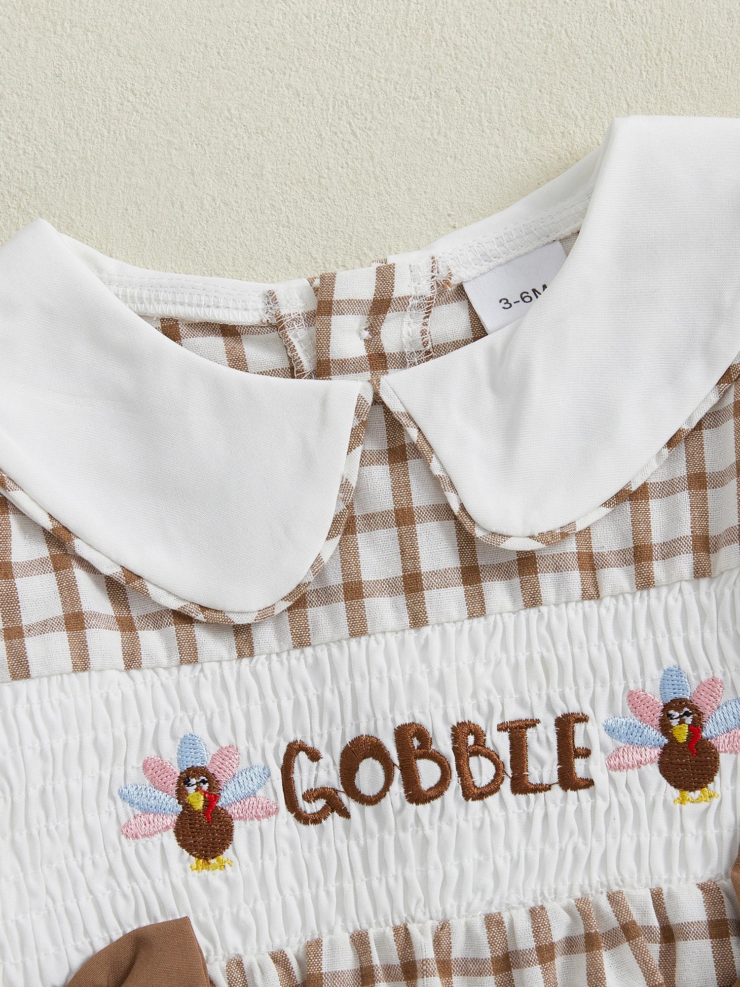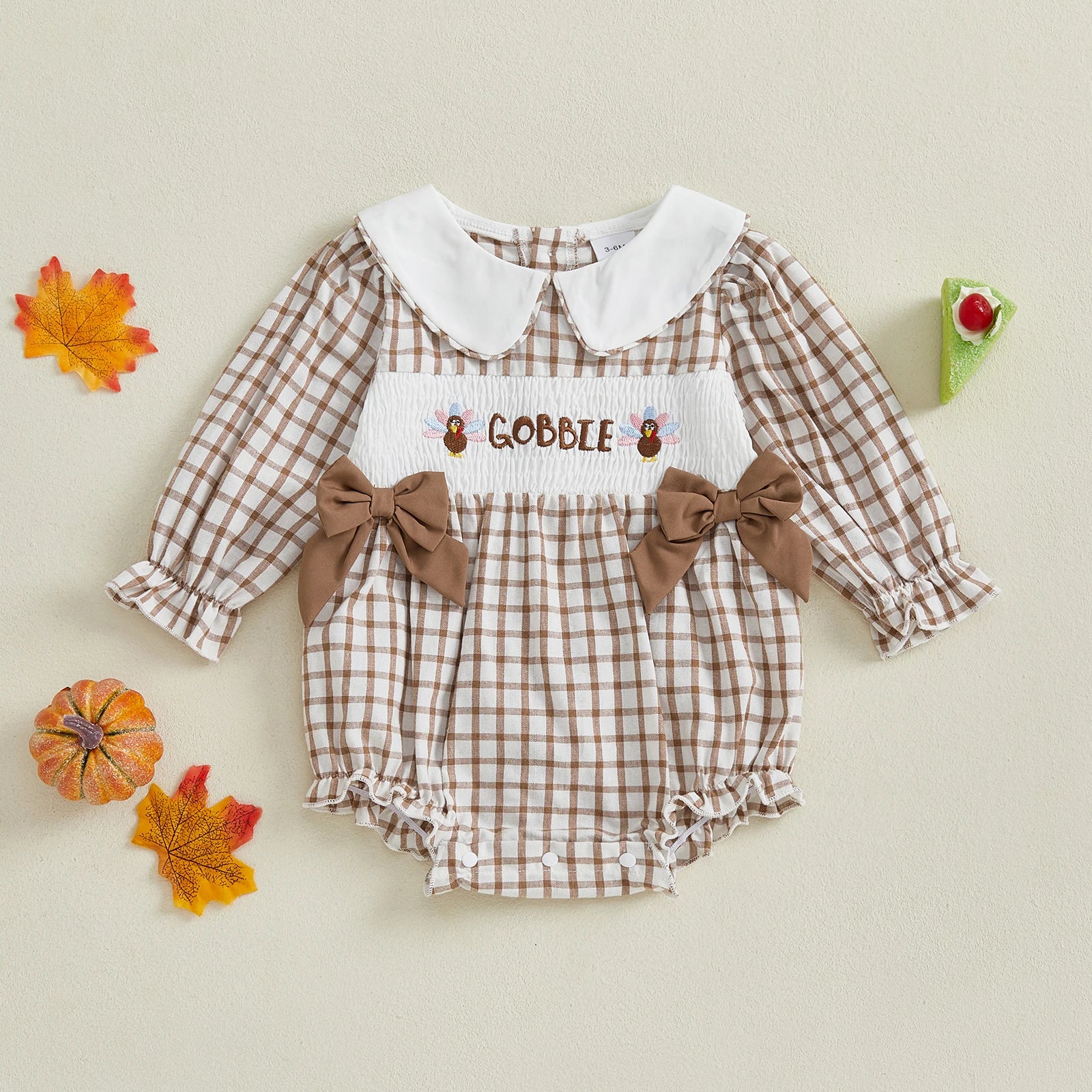 Baby Girl Thanksgiving Romper – Long Sleeve Plaid Jumpsuit with Doll Collar & Turkey Embroidery