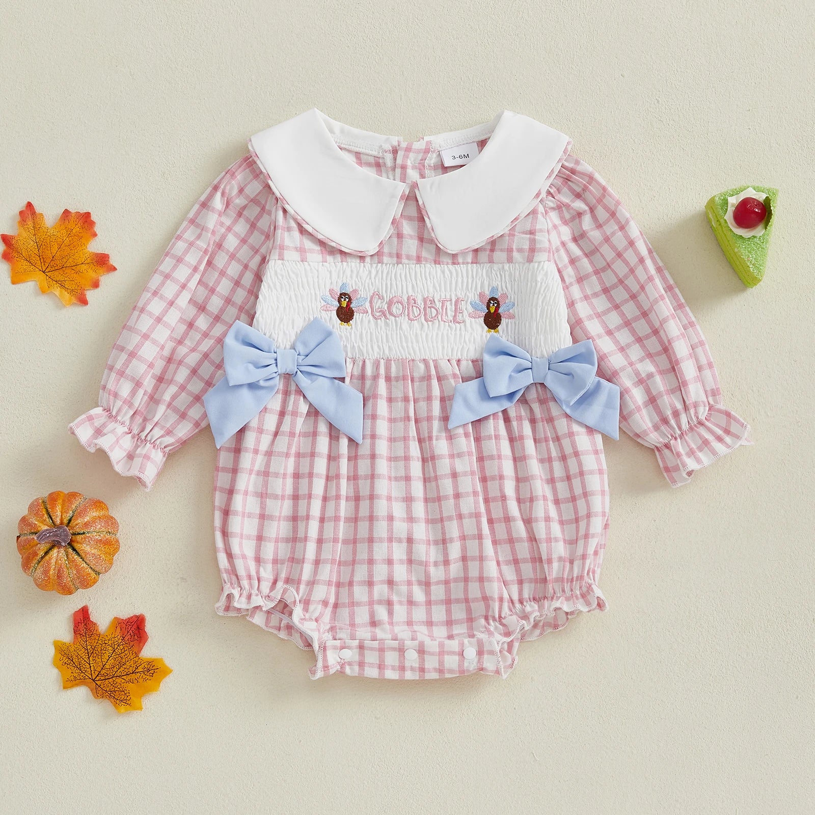 Dress your little one in festive fall style with this adorable Thanksgiving romper. Made from 65% cotton and 35% polyester, it’s soft, breathable, and gentle on your baby’s skin while offering lasting comfort. The long sleeve plaid design features a charming doll collar and cute turkey embroidery, perfect for celebrating Thanksgiving in style. With convenient snap buttons, diaper changes are quick and easy. Ideal for holiday gatherings, family photos, or everyday wear throughout the fall season, this plaid jumpsuit combines warmth, cuteness, and comfort for your baby girl.