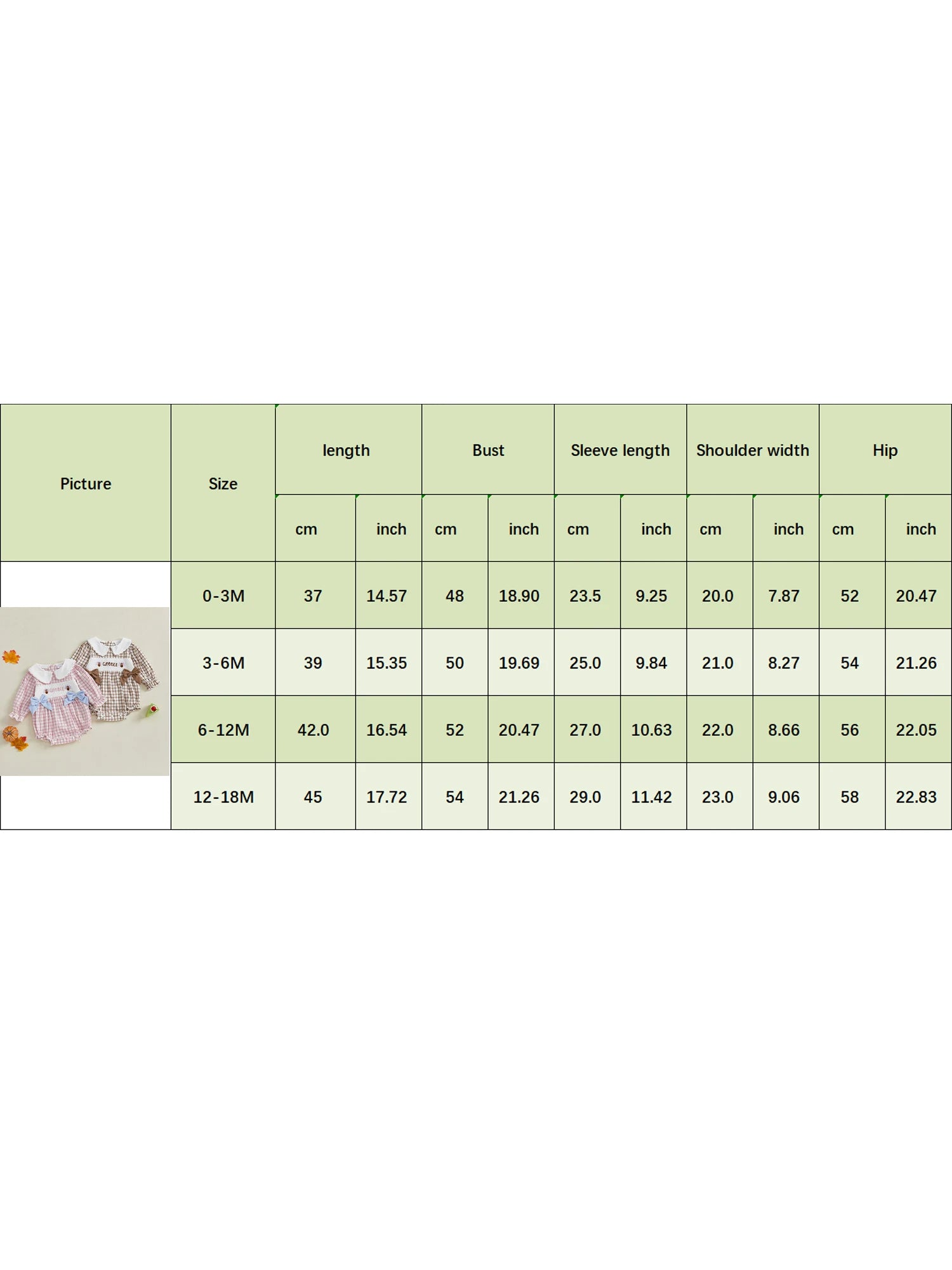 0-3M Length: 14.57 Bust: 18.9 Sleeve: 9.25 Shoulder: 7.87 Hip: 20.47 Advised Age: 0-3 Months